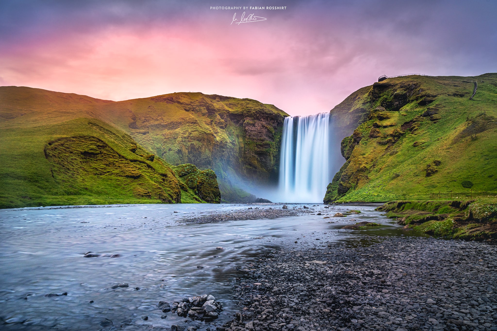 Island, Iceland, Insel, Wasserfall, Skógafoss, Skogafoss, Sonnenuntergang, Natur, Grüne Berge, Moos, FALLING GRACE (Island Wallpaper HD Wandbild Wandbilder Hintergrundbild Background)